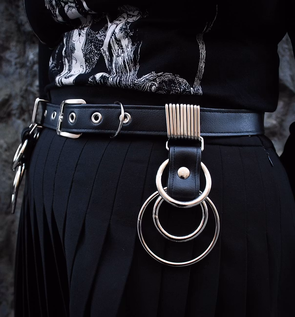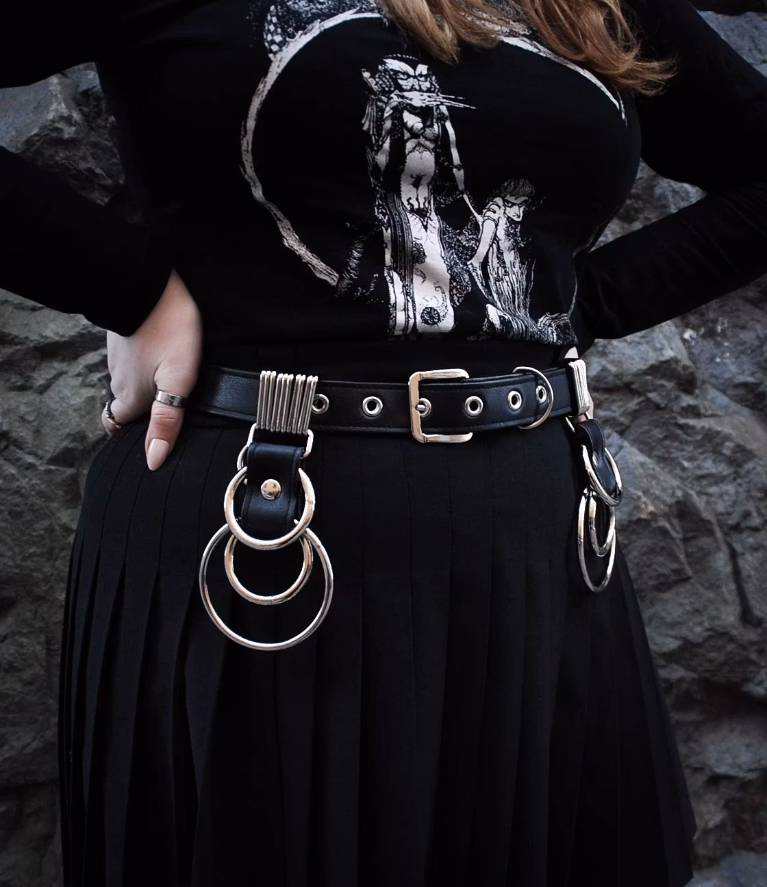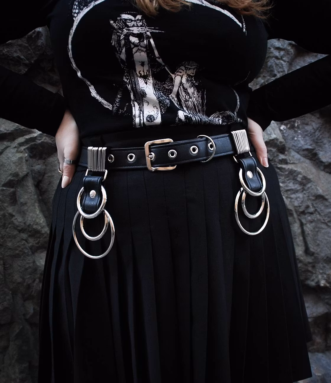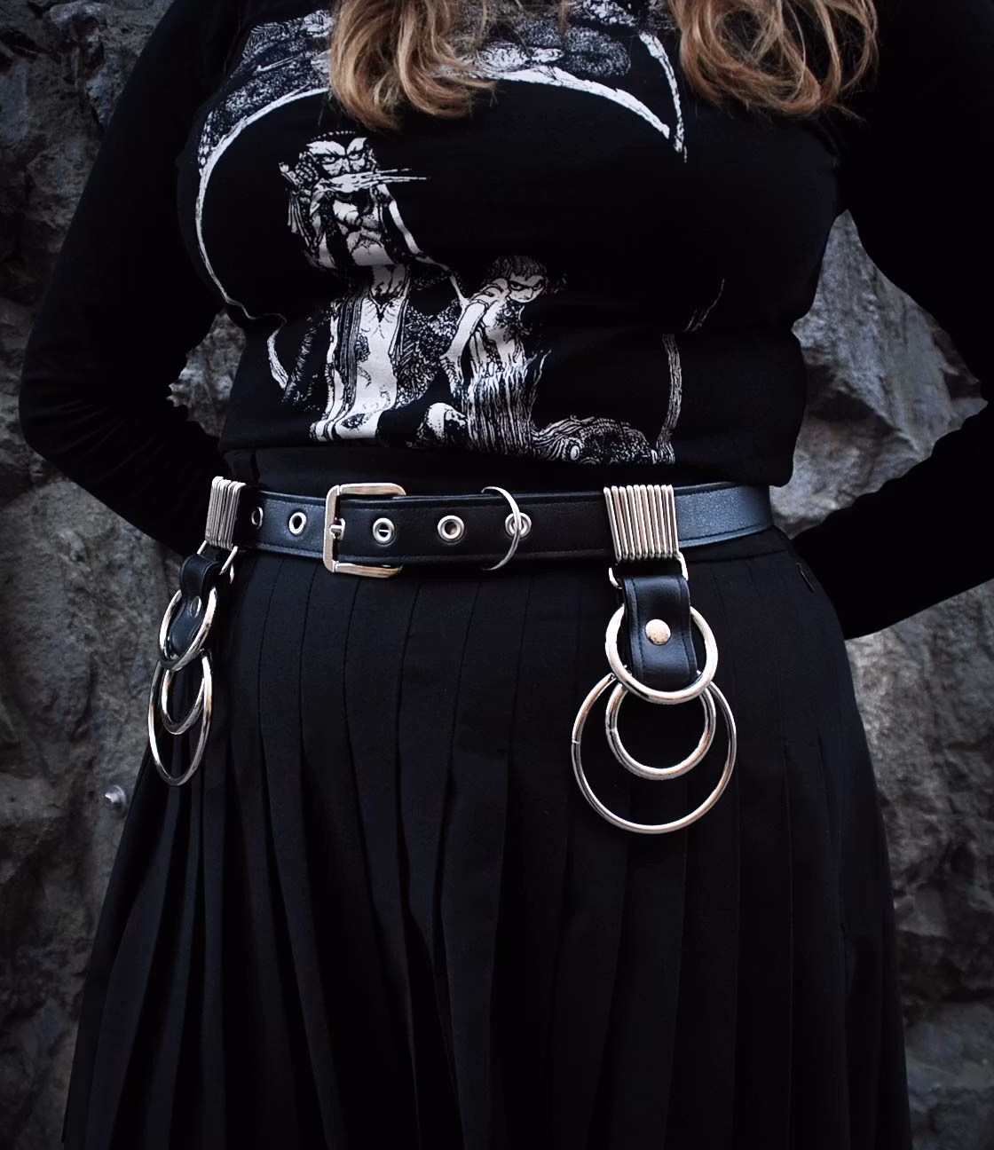 Cathedral är ett handgjort bälte tillverkat i veganskt läder och med detaljer i silvermetall. Det mäter 3 cm på bredden och har två avtagbara detaljer med tre ringar vardera. Ett mångsidigt bälte tack vare de avtagbara delarna, vilket gör det utmärkt till vardag likväl som till fest.