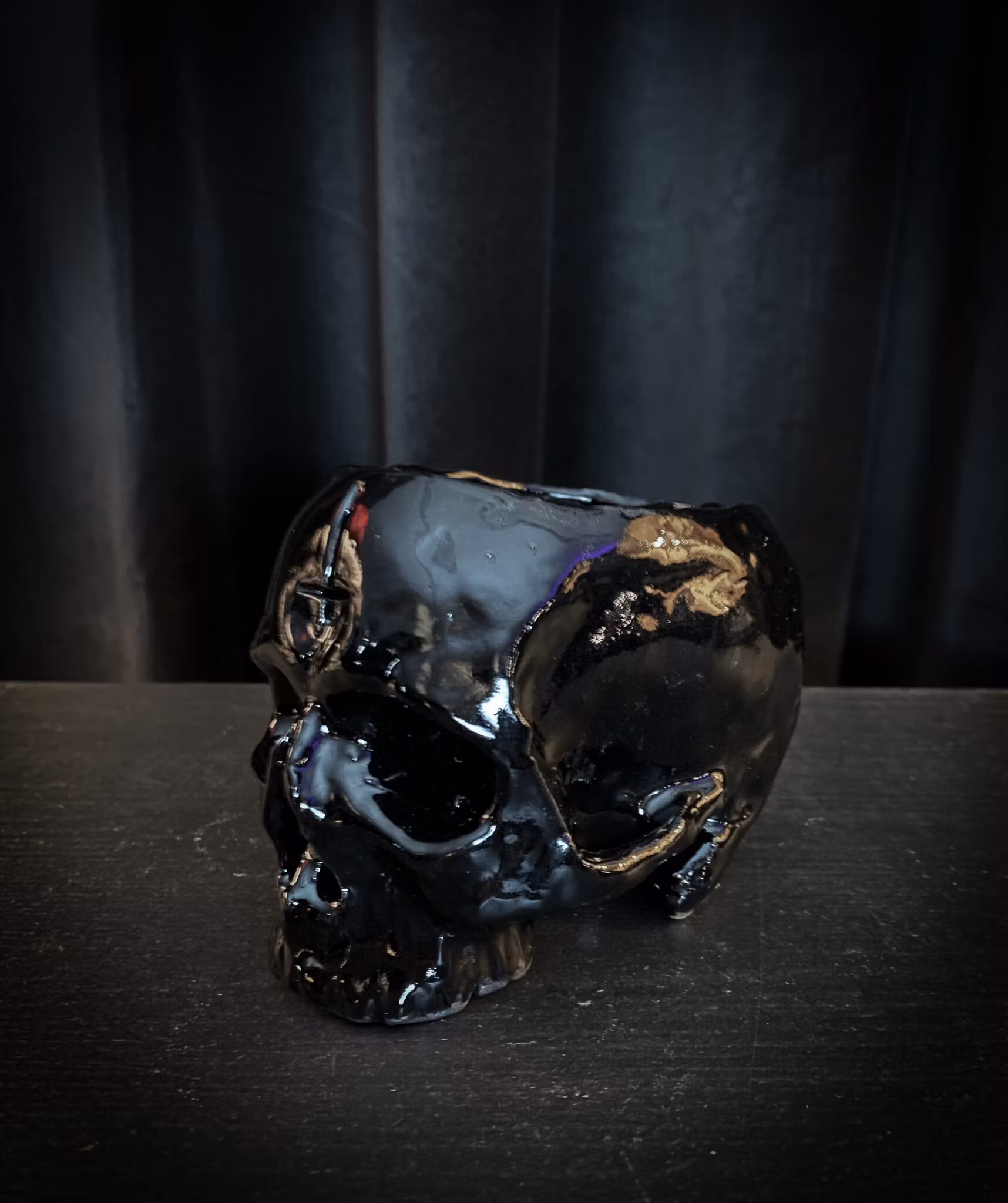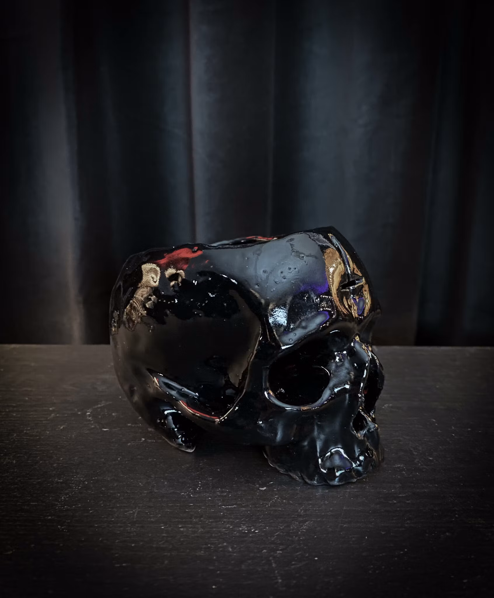 Handgjorda skallar i stengods som är täckta med en svart blank glasyr. Dessa skulpturer är inte bara ett fantastiskt hantverk utan är dessutom gjorda som ljusstakar. Perfekt för att sätta rätt stämning i hemmet. Observera att varje skalle är skapad förhand och kan därför skilja sig något från produktbilden.