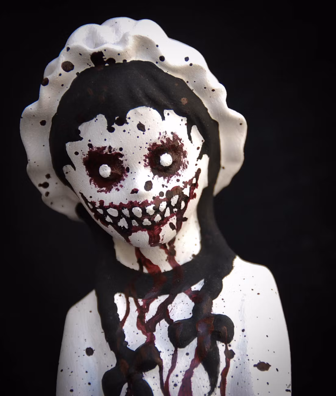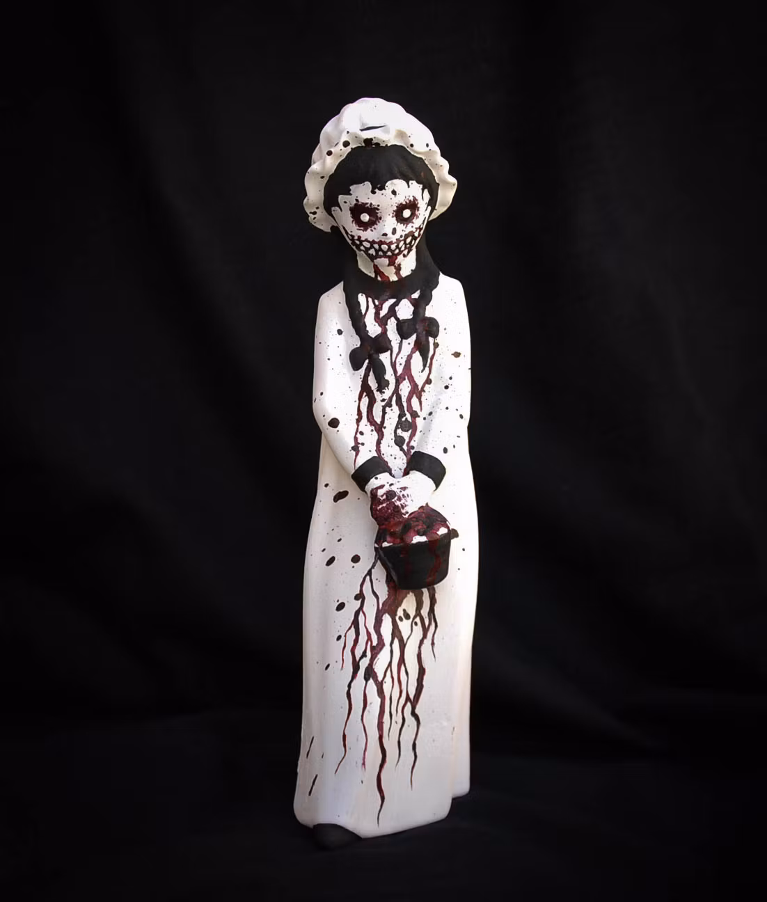 Omgjord porslinsfigur som vi målat för hand och satt vår egen prägel på. Dorothea var en liten flicka som sägs ha vandrat skogsstigarna kring gårdarna i Gråmyrheden i Dalarna under slutet av 1800-talet, alltid med sin korg tätt intill sig. Ingen visste först vad hon bar på. Byborna trodde att hon samlade örter eller matrester, men de som följde efter henne i skymningen kom aldrig tillbaka. Det gjorde däremot Dorothea och då med blodfläckar i ansiktet och på nattlinnet och korgen överfull med färska likdelar och inälvor. Den som mötte hennes blick fick ett groteskt leende tillbaka, där en rad sylvassa tänder långsamt blottades.