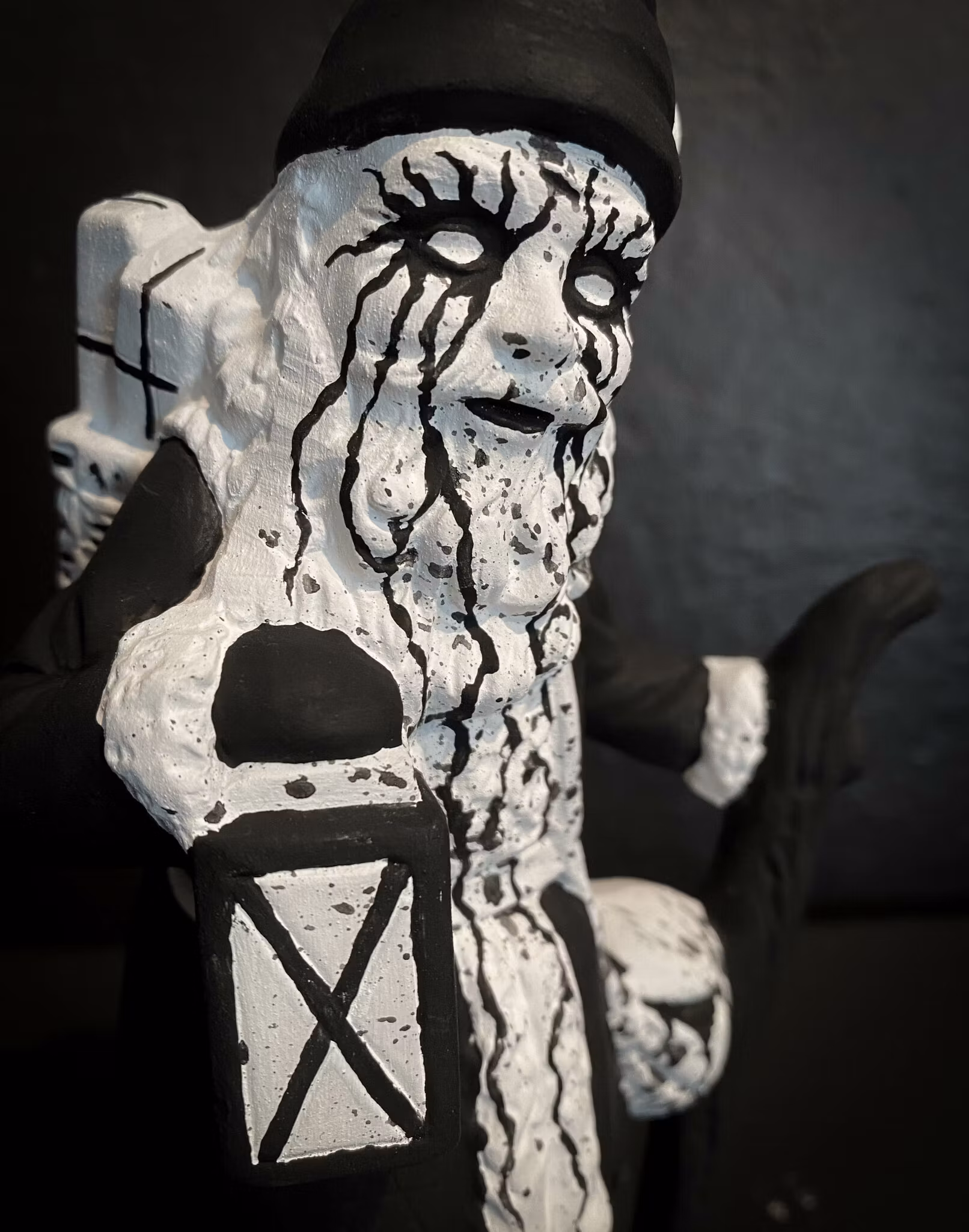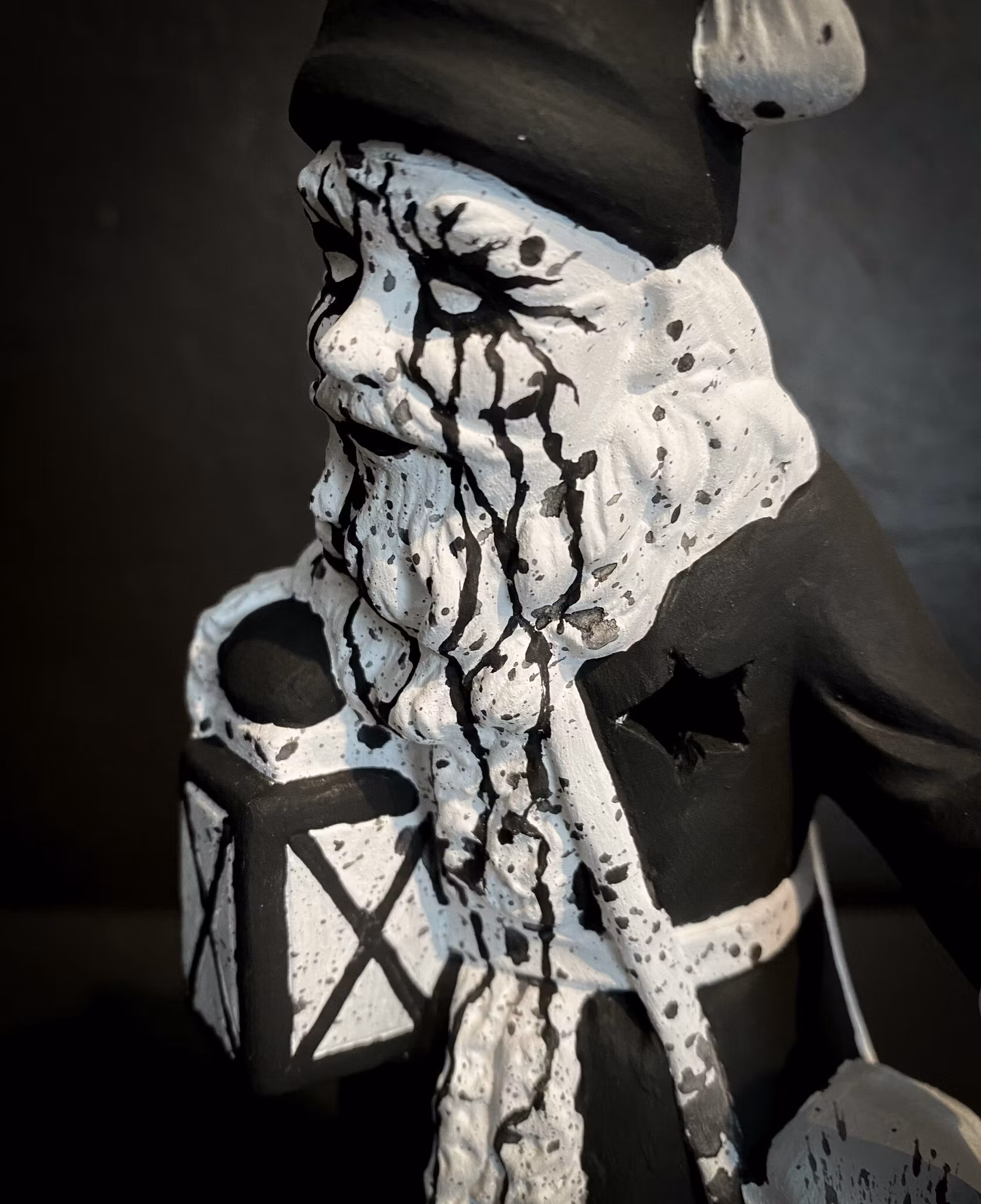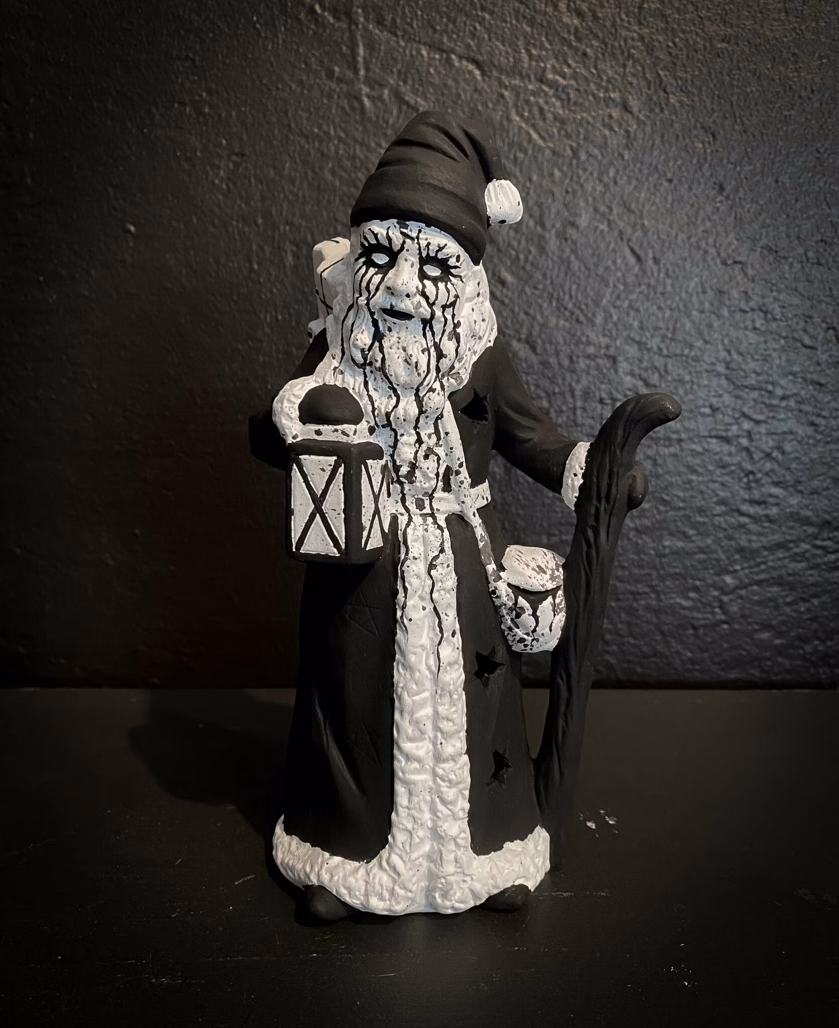 Omgjord prydnadstomte med plats för värmeljus, som vi målat för hand och satt vår egen prägel på.